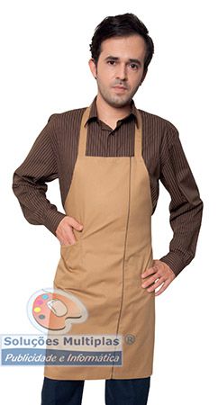 Avental comprido com tira única que passa pelo pescoço e laterais, para ajustar o avental.