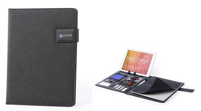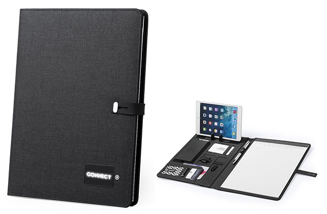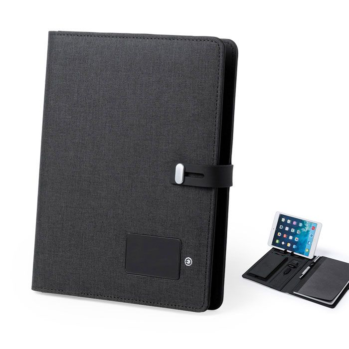 Pasta em poliéster 300D com bateria auxiliar de 4000 mah, bloco de 20 folhas. Entrada micro USB. Cabo incluído.
