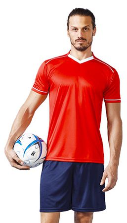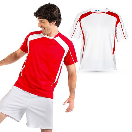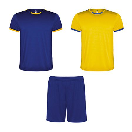 Conjunto adulto desportivo unisex composto por 2 camisolas de mangas curtas + 1 calção. Mangas curtas com vivo largo a contrastar. A cor da segunda camisola de mangas curtas compõe as cores invertidas. Gola redonda com debrum de cor dupla, com cobre costuras reforçadas no interior. Calções com cós elástico com cordão interior a combinar com a costura de segurança. 100% poliéster, 140 g/m². Tamanhos: M, L, XL, XXL.