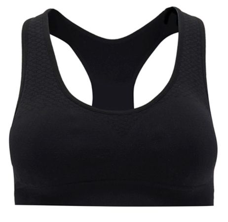 Top técnico feminino multi-desportos. Costas estilo nadadora e sem costuras. Fixação média. 60% nylon / 30% poliéster / 10% elastano, 240 g/m². Cor preto 02: 90% nylon / 10% elastano, 240 g/m²
