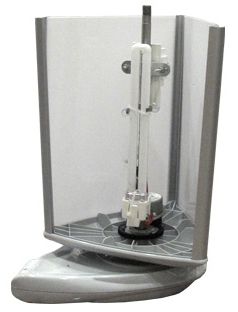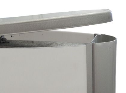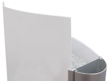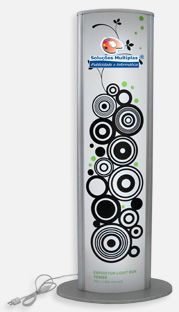 Expositor estático iluminado em forma de torre oval. Possibilidade de aplicação de grafismos em ambas as faces.