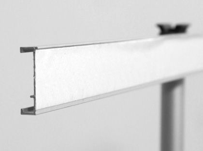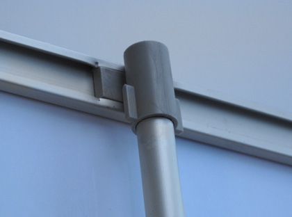 Expositor estático com base em L e um mastro de alumínio. Método de fixação do poster por entalamento na base e no topo. Aplicação de grafismos numa só face. Várias larguras disponíveis.