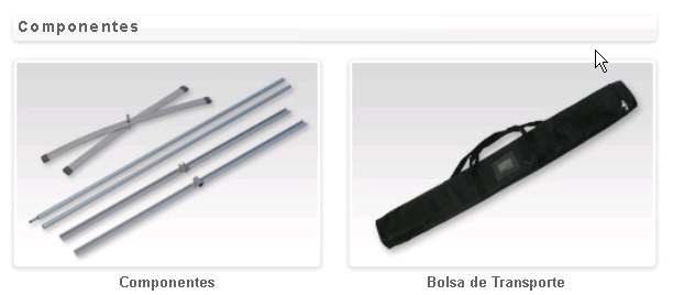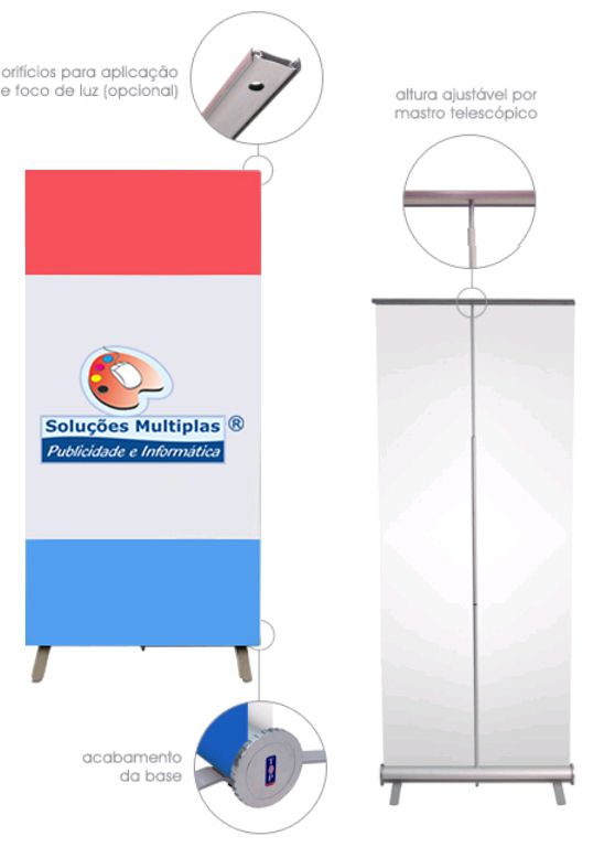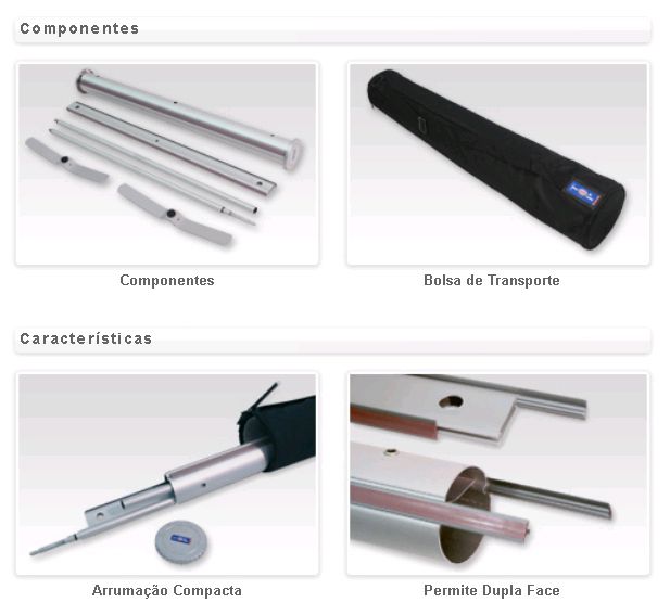 Expositor estático com base estável e um mastro de alumínio. Possibilidade de ajustar a altura do expositor através do mastro telescópico. Método de fixação do poster por colagem na base e no topo. Aplicação de grafismos nas duas faces.