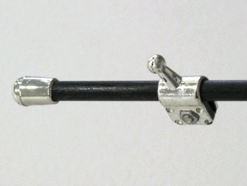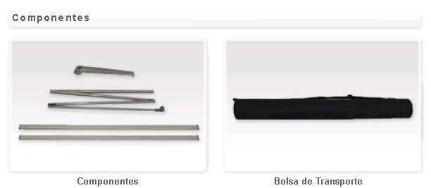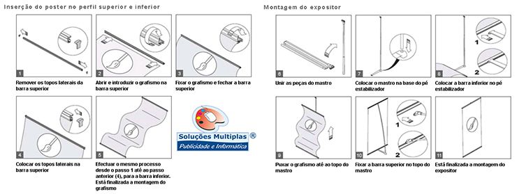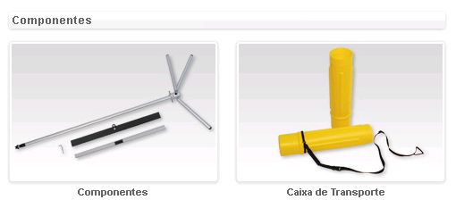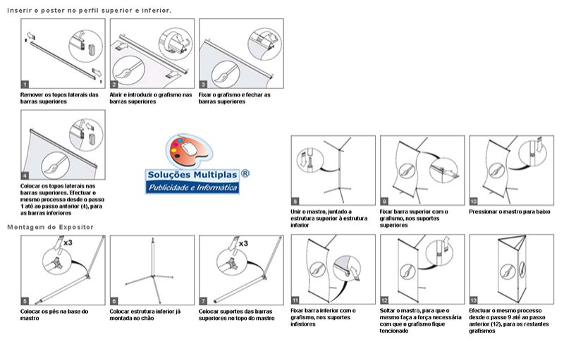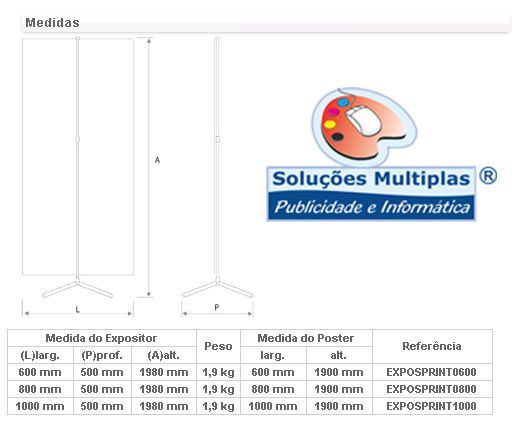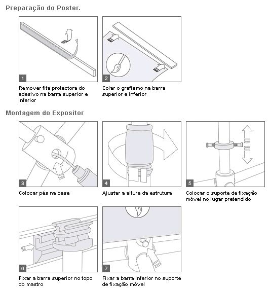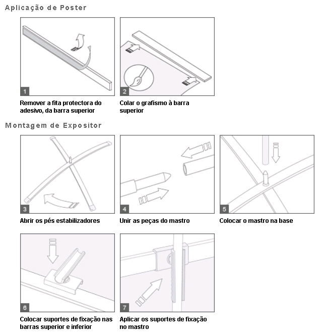 Expositor estático com base de quatro pés em cruz e um mastro de alumínio. Possibilidade de ajuste da altura na base, pois o topo fica sempre fixo. Método de fixação do poster por colagem na base e no topo. Aplicação de grafismos numa só face.