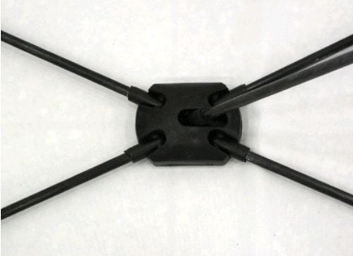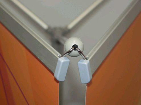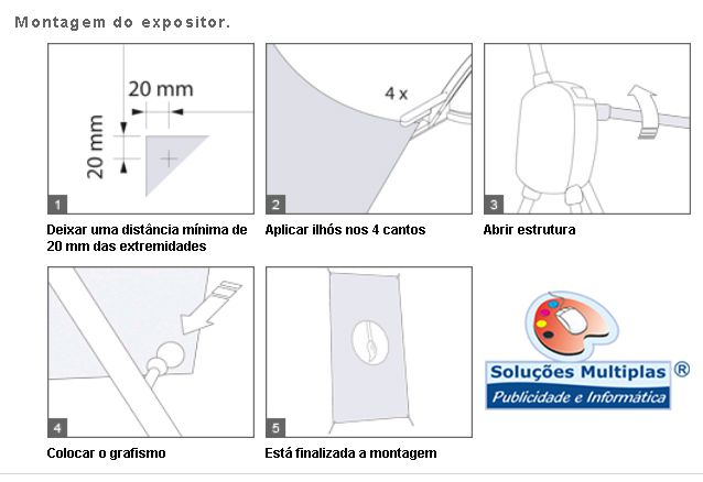 Expositor estático em forma de «X». Método de fixação do poster por aplicação de 4 ilhós nos cantos e posterior encaixe nas extremidades, de modo a flectir a estrutura e consequente tensionamento do grafismo.