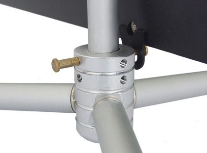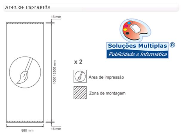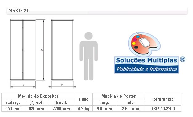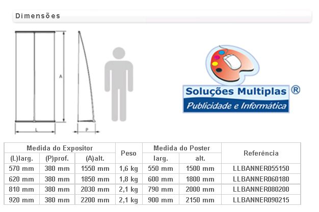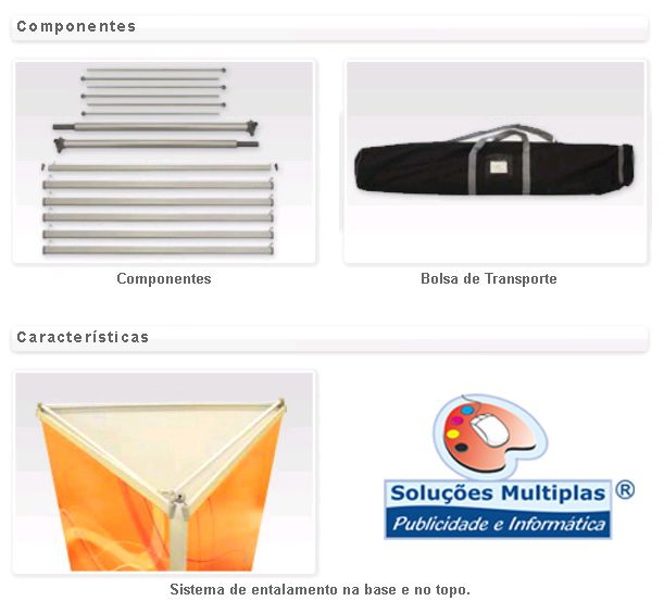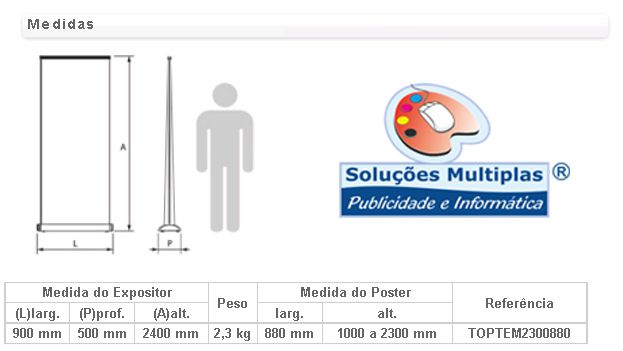 Expositor estático com base de três pés em «Y» e um mastro de alumínio. Possibilidade de ajuste da altura através do mastro telescópio. Método de fixação do poster por colagem na base e no topo. Aplicação de grafismos em ambas as faces.
