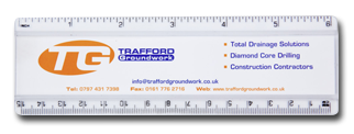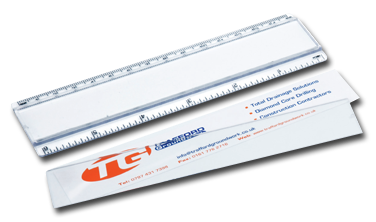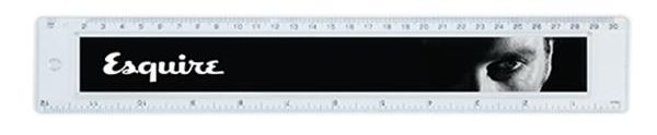 Régua de 30cm transparente com tampa acrílica e escala impressa.
