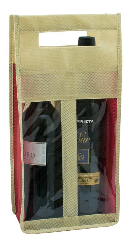 Saco de cartão 2 garrafas, cor Kraft, com impressão decorativa e janelas.