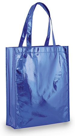 Saco non-woven laminado com acabamento metálico de 80g / m2, Várias cores vivas. Com asas médias de 50cm, fole reforçado com rebordo. Acabamento cosido. Resistência até 7kg de peso.