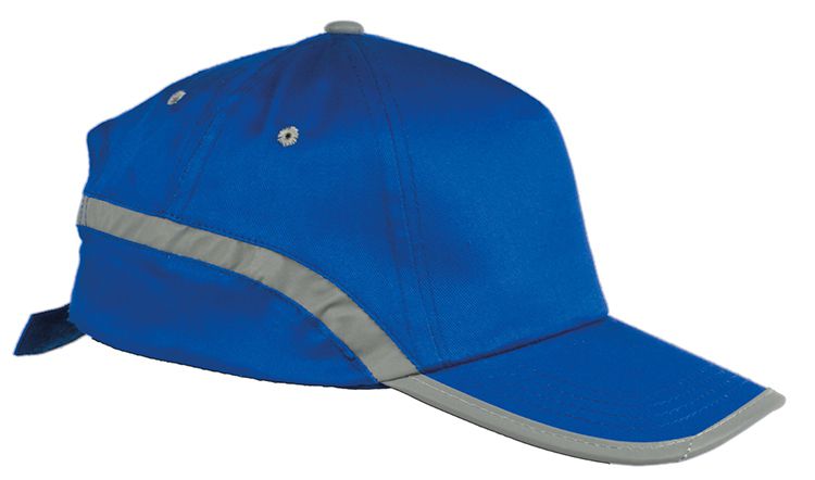 Boné de adulto com banda reflectora 5 painéis e fecho em velcro. Agodão. Peso: 75gr.