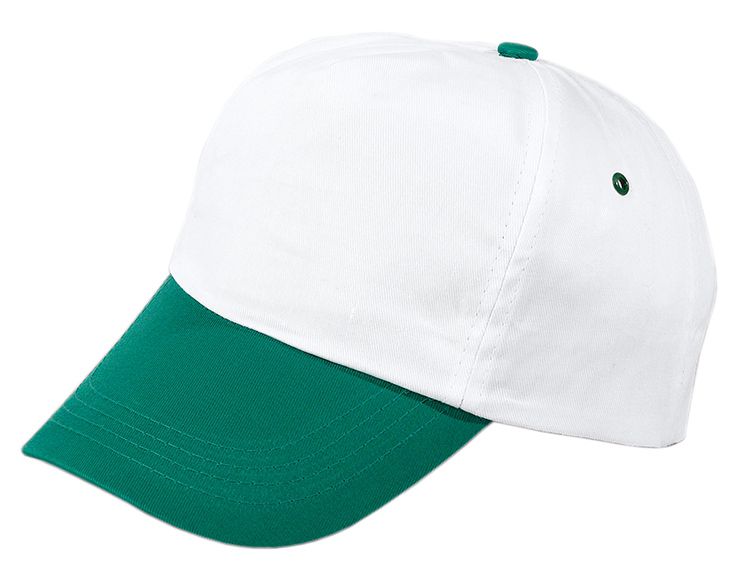 Boné bicolor de adulto com 5 painéis e fecho em velcro. Agodão. Peso: 50gr.